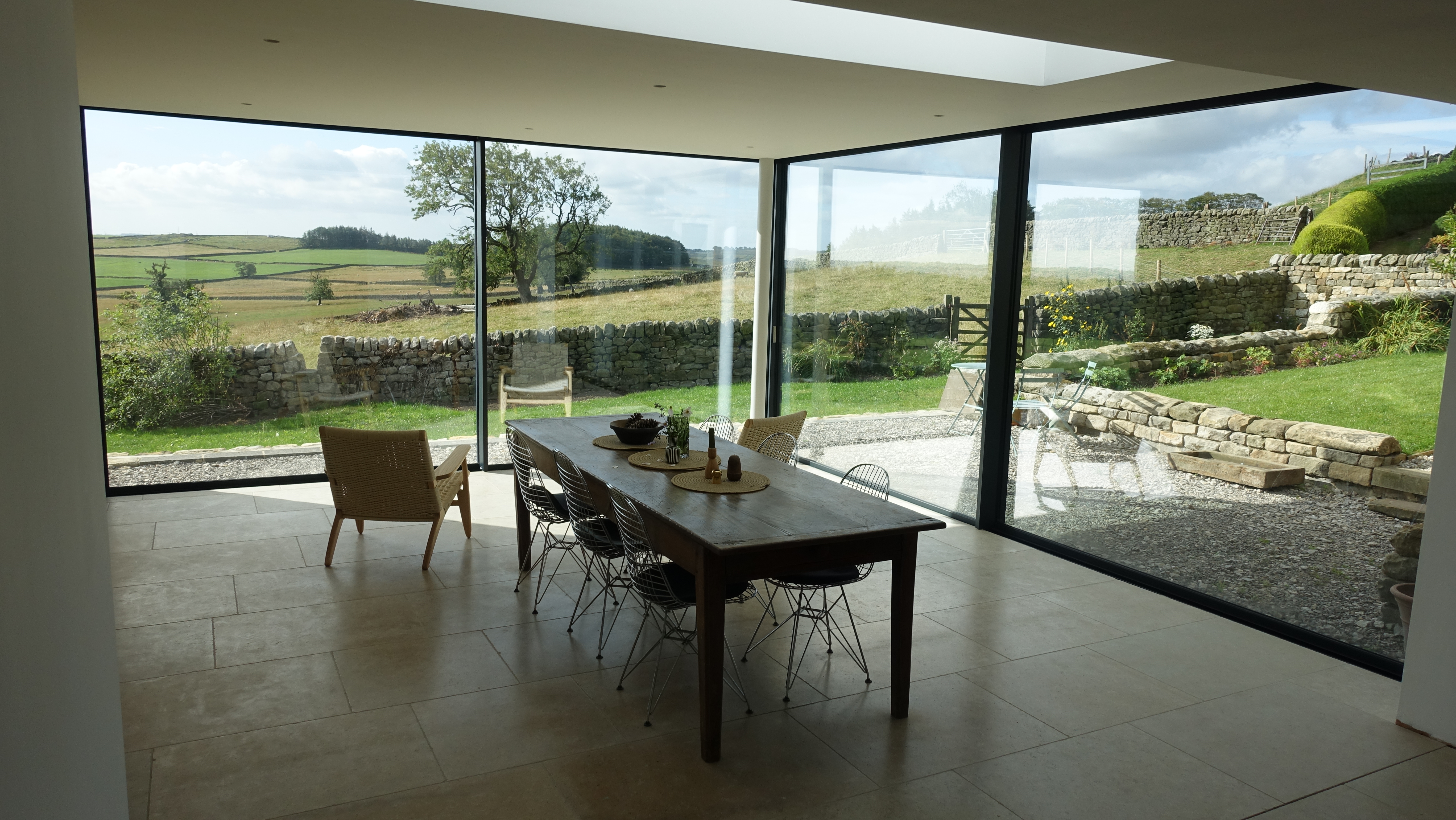 A barn extension in North Yorkshire with wonderful views over open countryside was taken to the next level with large open corner sliding doors.